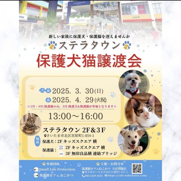 | イベント内容 | *保護猫讓渡会* 日時:3/30(日) 13時~16時 場所:ステラタウンさま ステラタウンさま譲渡会に参加予定です。 センターからの引き出し、飼育崩壊や所有権放棄などで、生きる場所を失った猫たちが、最大限の医療にかけてピカピカになりました。 写真の猫の他にも甘えっこちゃんたちが、溢れる笑顔でお待ちしています。 ぜひご参加ください。 ***譲渡条件*** *完全室内でお願いします。 *逸走防止対策にご協力頂ける方 *写真付きの身分証をご提示頂ける方 *LINE若しくはメールでのやりとりが可能な方 *譲渡に関する覚え書きにご署名頂ける方 *初期医療費をご負担頂ける方 *その他の譲渡条件を、譲渡会場でお話させて頂ける方 *猫が生まれた年から20年後に、80歳を超えていない方 *お一人暮らしの方は、後見人さまのご同席が必要です |