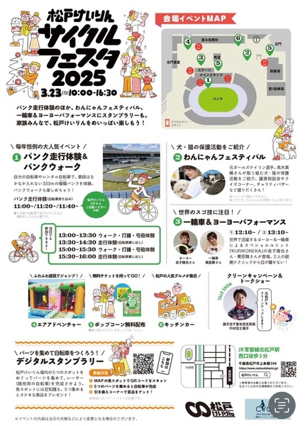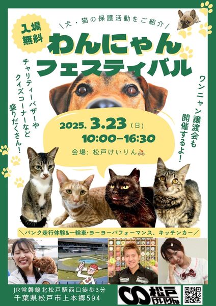 | イベント内容 | 【松戸けいりん】 サイクルフェスタ?イベント内 ワンニャンフェスティバル?? 保護犬、保護猫譲渡会へ参加いたします。 松戸けいりん JR常磐線北松戸駅徒歩3分 千葉県松戸市上本郷593 イベント開催時間 10:00〜16:30 元競輪女子選手:高木真備さんが主催取り組みを行う 保護犬猫活動イベント⭐️ 譲渡相談会や、チャリティーバザー、クイズコーナー 松戸けいりん場内ではバンク走行・ウォーク体験、一輪車&ヨーヨーパフォーマンス、キッチンカーと楽しいイベントブース盛り沢山です! 入場無料!ご来場をお待ちしております?✨ |