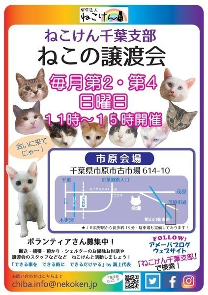 | イベント内容 | 千葉県の「殺処分0!野良猫0!」を目指し2018年7月に発足した「ねこけん千葉支部」の譲渡会です。 毎月第2・4日曜日の月2回開催!! 今月は2月9日と23日(日)です!! 譲渡会デビューする子もたくさん♪※体調によりお休みの場合もあります。 ブログで見るあの子は?とお声をかけていただければご案内しますので、 是非会いに来てくださいね! ※ネット掲載されていない子猫ちゃん&成猫ちゃんも多数参加!!! 参加の猫ちゃんは、可能な限りブログで随時お知らせしていきます! ↓↓↓ https://ameblo.jp/nekoken-chiba/ また、譲渡会会場では、千葉県内にお住いの預かりボランティアさん及びお世話ボランティアさんを募集しています。 ご希望の方は、大変お手数をおかけしますが、譲渡会までお越しください。 ※ご都合がつかない場合は、お問い合わせ先までご相談ください。 [日時] 2月23日(日)11:00~15:00 [会場] 千葉県市原市古市場614-10 ※屋内での開催となり雨天決行です。 ※抱っこもOK! ※猫ちゃんの負担も考え、ご来場は時間内にお願い致します。 ※特にご予約などは必要ございませんのでご家族皆様でぜひお越し下さい。 ※駐車場あり。 [交通] 交通機関を利用してお越しの方 JR内房線 浜野駅より徒歩13分 浜野駅は、東京駅から京葉線→内房線でおよそ50分の距離!! お車でお越しの方 京葉道路蘇我インターより車で10分 ※駐車場はラジコンショップハッピー様裏手にございます駐車場をご利用ください [譲渡ご希望の方へのお願い] 誠に恐れ入りますが下記に当てはまります方への譲渡は不可となりますので予めご了承下さい。 ①学生さん、未成年の方、安定収入のない方 ②ペットを飼う事を許されていない住宅にお住まいの方 ③身体的、精神的疾病で治療中の方 ※60歳以上の方は別途条件がございますのでご相談下さい。 [譲渡の流れ] お申込み→審査→後日お届け→トライアル→正式譲渡 ※当日のお連れ帰りは出来ませんので予めご了承ください。 ※仮譲渡時にご希望の猫ちゃんにかかった医療費(血液検査・ワクチン・駆虫・不妊去勢手術等)をご負担願います。 しかし、正式譲渡に至らなかった場合は医療費を全額返済致します。 [主催] 動物愛護団体 NPO法人ねこけん 千葉支部 [ブログ] https://ameblo.jp/nekoken-chiba/ [参加動物] 成猫・子猫(ねこけん保護猫以外の猫ちゃんも参加予定です) [お問い合わせ] ご不明な点、ご質問等ございましたら下記までお問い合わせください。 chiba.info@nekoken.jp ※譲渡会へお越しの際、特に予約等必要ありません。 |