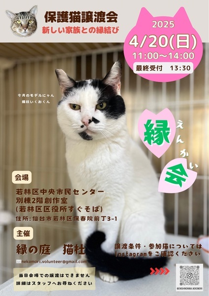 | イベント内容 | 縁の庭猫社(えにしのにわねこもり)です。 若林区中央市民センターの別棟2階創作室にて保護猫譲渡会『縁会』(えんかい)を開催いたします。 たくさんのかわいい猫たちがずっとのおうちを探しています。 会場から桜も見れるかも!? ご来場心よりお待ちしております。 |