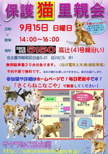 | イベント内容 | 子猫中心の里親会を開催します。 約30匹の保護猫が参加予定です。 予約不要で無料です。無料駐車場20台分あります。 初めて猫を飼われる方もできる限りのサポートをさせていただきます。 参加猫や詳細はホームページでご確認ください! http://sakuranekonagoya.jp/ |