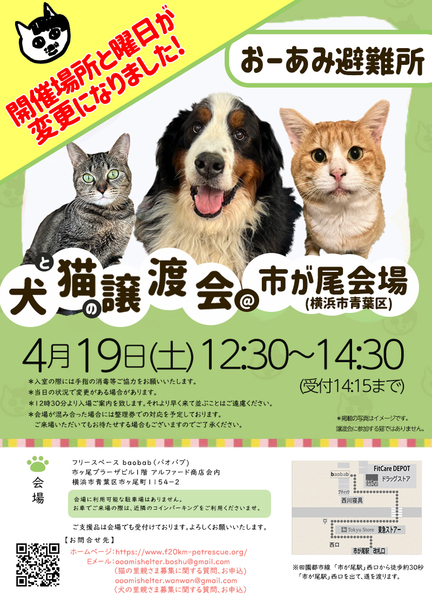 | イベント内容 | ☆★☆★☆★☆★☆★☆★☆★☆★☆★☆★☆★☆★☆ ~4月19日(土)市ヶ尾にて譲渡会開催!~ ◎場所・・「スペースbaobab」 神奈川県横浜市青葉区市ヶ尾町1154-2 市ヶ尾プラーザビル1階アルファード商店会内 田園都市線「市が尾」駅西口より徒歩約30秒 ◎日程・・4月19日(土)(雨天決行) ◎時間・・ 12:30~14:30 (会場に利用可能な駐車場はございません。近隣のコインパーキングをご利用ください。) *参加の際は、アルコール消毒のご協力をお願いいたします。 *混雑状況により、入場制限をさせていただく場合がございます。 ※参加予定の犬猫は体調により参加できない場合があります。ご了承ください。 ☆★☆★☆★☆★☆★☆★☆★☆★☆★☆★☆★☆★☆ |