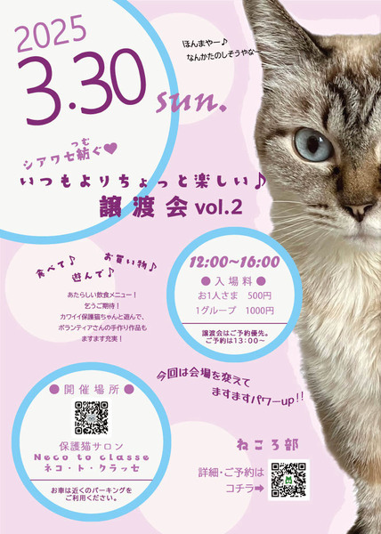 | 開催場所 | 松原市一津屋5-1-2 双葉工業株式会社様2階(外階段使用) 保護猫サロン ネコ・ト・クラッセ | ||