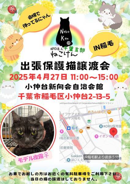 | イベント内容 | 4月も出張譲渡会を開催します♪ 子猫からシニア猫まで、沢山の保護猫達が譲渡会に参加します。 ブログにて、譲渡会に参加する猫さん達を紹介しております。 ねこけん千葉支部ブログ→ https://ameblo.jp/nekoken-chiba/ 通常スタイルの譲渡会と致しますが、コロナウイルス/インフルエンザ対策として ・入退室の際は消毒をお願い致します。 ・ご予約無しでお越しいただけますが、混雑時は整理券を配らせていただきます。 ご協力の程よろしくお願い致します。 また、譲渡会会場では、千葉県内にお住いの預かりボランティアさん及びお世話ボランティアさんを募集しています。 ご希望の方は、大変お手数をおかけしますが、譲渡会までお越しください。 ※ご都合がつかない場合は、お問い合わせ先までご相談ください。 [日時] 4月27日(日)11:00~15:00 [会場] 千葉県千葉市稲毛区小仲台2-13-5 小仲台新向会自治会館 (イオン稲毛店様 立体駐車場入り口から徒歩1分) ※屋内での開催となり雨天決行です。 ※抱っこもOK! ※猫ちゃんの負担も考え、ご来場は時間内にお願い致します。 ※特にご予約などは必要ございませんのでご家族皆様でぜひお越し下さい。 [交通] 交通機関を利用してお越しの方 JR稲毛駅 東口より徒歩5分 お車でお越しの方はお近くの有料駐車場をご利用ください。 [譲渡ご希望の方へのお願い] 誠に恐れ入りますが下記に当てはまります方への譲渡は不可となりますので予めご了承下さい。 ①学生さん、未成年の方、安定収入のない方 ②ペットを飼う事を許されていない住宅にお住まいの方 ③身体的、精神的疾病で治療中の方 ※60歳以上の方は別途条件がございますのでご相談下さい。 [譲渡の流れ] お申込み→審査→後日お届け→トライアル→正式譲渡 ※当日のお連れ帰りは出来ませんので予めご了承ください。 ※仮譲渡時にご希望の猫ちゃんにかかった医療費(ウイルス検査・ワクチン・駆虫・不妊去勢手術等)をご負担願います。 しかし、正式譲渡に至らなかった場合は医療費を全額返済致します。 [主催] 動物愛護団体 NPO法人ねこけん 千葉支部 [ブログ] https://ameblo.jp/nekoken-chiba/ [参加動物] 成猫・子猫 [お問い合わせ] ご不明な点、ご質問等ございましたら下記までお問い合わせください。 chiba.info@nekoken.jp |