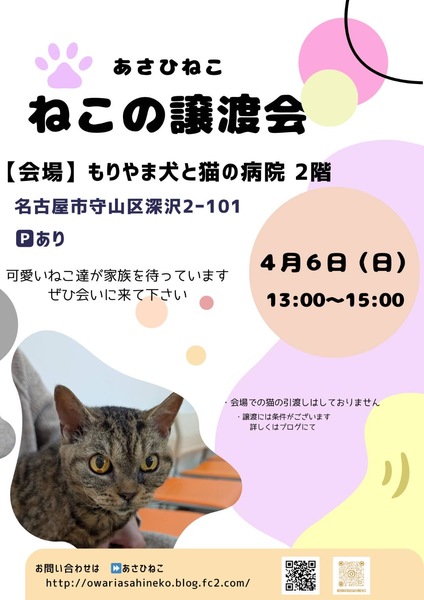 | イベント内容 | 行政機関(保健所・動物愛護センター)から引き取った猫や、地域猫活動中に保護した猫達に家族を探しています (=゚ω゚=) ♡猫を初めて迎えてみたい ♡運命の猫ちゃんと出会いたい ♡先住猫ちゃんの仲間探し 皆様のご来場をお待ちしております! 4月6日(日) 13:00〜15:00 ※毎月第1日曜日 会場 もりやま犬と猫の病院 2F 愛知県名古屋市守山区深沢2-101 駐車場あり ※病院へのお問い合わせはご遠慮下さい お問い合わせはコチラ ma47m@yahoo.co.jp ┈┈┈┈┈┈┈┈┈┈ ◎全頭ワクチン接種、ウイルス(FIV、FeLV)検査、マイクロチップ装着済み ◎譲渡には条件がございます 詳しくは下記ブログをご覧ください ↓↓↓ 主催者【あさひねこ】ブログ http://owariasahineko.blog.fc2.com/ |