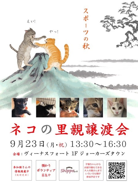 | イベント内容 | 続けて開催!9月23日(月・祝)ヴィーナスフォートで里親譲渡会を開催致します。 13時30分スタートです! 参加猫さんはこちらからご覧下さい。(随時更新) ↓ https://www.pet-home.jp/member/user360938/post/ https://www.pet-home.jp/member/user574503/post/ https://www.pet-home.jp/member/user247571/post/ 子猫ちゃんたちも参加予定なので、小さい頃から一緒に暮らしたい、育てたいとお考えの方、ぜひお越しください! 一人暮らしの方やご高齢の方にもぴったりの、まったりした大人猫さんたちも参加予定です。 参加できない猫さんたちも、会場内で紹介予定です。 きっと、運命の出会いがあると思います。 里親希望の皆さま、ぜひ、足をお運びください! ●日時:9月23日(月・祝) 13:30~16:30 ●会場:ヴィーナスフォート 1Fジョーカーズタウン内(ペットと暮らそう) 東京都江東区青海1-3-15 下記店内マップをご参照ください。 https://www.venusfort.co.jp/floormap/1f.html ●アクセス ゆりかもめ「青海駅」徒歩6分 りんかい線「東京テレポート駅」徒歩10分 ●参加猫および諸条件については、下記「ペットのおうち」からご覧ください。 (随時更新) https://www.pet-home.jp/member/user360938/post/ https://www.pet-home.jp/member/user574503/post/ https://www.pet-home.jp/member/user247571/post/ ☆譲渡には当会における一定の条件があります。 ☆当会および里親譲渡会についてのお問い合わせ ☆外猫、保護猫のために物資のご支援を頂ける方がおりましたら、送付先をご連絡させていただきますのでご連絡下さい。 ☆預かりボランティアさん、活動のお手伝いをして頂ける方も随時募集中です。 hilakoma@yahoo.co.jp |