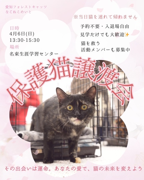 | イベント内容 | 日時 4月6日(日) 13:30〜15:30 場所 名東生涯学習センター 主催 愛知フォレストキャッツwithなごねこめいと 地域猫活動やTNR活動の過程などで 保護した猫たち 子猫もいれば、大人猫もいます 見学、相談だけでも大丈夫! 予約不要、参加費無料なのでお気軽に 猫に関する活動を何かしたい、という方も歓迎です 遊びに来る感覚で、お越しくださいませ |