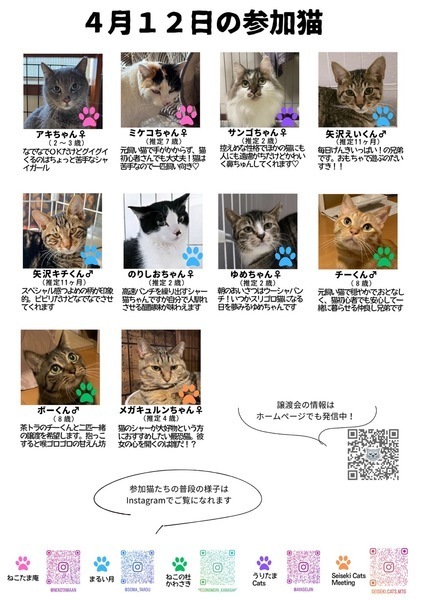 | イベント内容 | 【多摩市聖蹟桜ヶ丘】保護猫譲渡会 多摩市を中心に猫ボランティア協働で保護猫の譲渡会を開催しています。 事情があって保護された猫さんたちが参加予定です。 チラシに付いてるQRコードまたはこちらのリンクから 猫たちの様子が見れます。 https://sites.google.com/view/cooneru/ 完全予約制ではありませんが、予約された方から優先的にご案内致します。 参加お申込み・お問合せはコチラ tamacity.cats@gmail.com 【日時】4月12日(土) 13:00〜16:00 【場所】桜ヶ丘キリスト教会 多摩市関戸3-14-12 (聖蹟桜ヶ丘駅徒歩8分) ※車でお越しの際は近隣のコインパーキングをご利用下さい。 【譲渡までの流れ】 ①譲渡会にて猫を決めたら預かりボランティアに話を聞く ②エントリーシートに記入 ③お届け(里親様宅へお伺いします) ④トライアル期間 ⑤誓約書を交わして本譲渡 【譲渡地域】 多摩市・府中市・日野市・八王子市・立川市・国立市・稲城市・相模原市・町田市・麻生区、他 【譲渡条件】 ①ペット可住宅にお住まいで、同居の方全員の了解がある ②経済的・体力的・時間的に猫を養える見込みがある ③完全室内飼い ④終生飼育 ⑤子猫の場合は留守にする時間が短いご家庭 ※単身者・高齢者の方には後見人必須 |