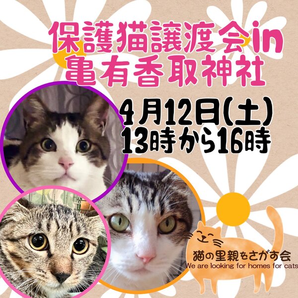 | イベント内容 | はじめての香取神社での里親会です。 JR亀有駅より徒歩4分 大型ショッピングセンター【Ario亀有】の目の前(環七沿い)です。 【こち亀記念館】へは徒歩1分 境内には【ラ・ローズ・ジャポネ】の美味しいケーキ屋さんがあります! 場所をお借し下さる【亀有香取神社】ではこち亀御朱印もあります☆彡 亀有には楽しい場所や美味しいお店が沢山ありますので是非保護猫譲渡会に来てみて下さい。 ※境内駐車場はお宮参り、厄除け、七五三詣、安産祈願などご社殿で祈願をお受けになられる方のみのご利用となります。譲渡会へお越し下さる方は近隣コインパーキングorアリオ亀有(スカイコートエスカレーター付近が最寄です)へ駐車頂きますよう、皆様のご理解とご協力をお願い申し上げます。 【亀有香取神社】 https://www.kameari-katori.or.jp/ 【猫の里親をさがす会】 https://x.com/shosukereiko https://blog.goo.ne.jp/bobton 家族の一員として生涯たっぷり愛情を注いでくださるご家庭をお待ちしています。できましたらご家族形態の方は皆さまでいらして下さい。 【以下の方には譲渡しておりません】 ・猫の飼育が許可されていない住居にお住まいの方 ・未成年者、友人同士&同棲でお住まいの方 ・乳児のいるご家庭、妊娠中の方 ・お引越し予定の方 ・60歳以上の方への子猫譲渡✖ 成猫については猫年齢に見合った年の方に譲渡検討しています。 ・脱走防止対策にご協力頂けない方 ・経済的に不安定な方(休職中、就職活動中、アルバイト、生活保護等) ・留守番の長いご家庭(子猫は✖) ・住居の構造をお聞きする事があります。(階下への騒音など) ・犬猫を4頭以上飼育している方 他、飼育に適切でないと判断した場合(個体により条件が若干違います) 【当里親会は猫さんと里親様とのマッチングを大切にしています】 はじめて猫さんをお迎えする場合に適した猫さん、お留守番の長い里親さんに適した猫など、ご状況に合わせてアドバイスしています。 【ご負担頂く費用について】 譲渡の際に活動協力金を里親様にご負担頂く事により飼い主のいない猫の継続的治療や保護、新しいご家族の元へ送り出す事ができます。 ご理解とご協力をお願い致します。 ◆活動協力金(譲渡費用)のご負担がございます。 ★成猫(マイクロチップ挿入済)1頭35.000 譲渡会に参加している成猫は不妊去勢が済んでいます。 健康チェック、ワクチン、ウイルスチェック、駆虫、検便、済。 ★子猫(マイクロチップ挿入済)1頭30.000 健康チェック、ワクチン、ウイルスチェック、駆虫、検便、済 |
