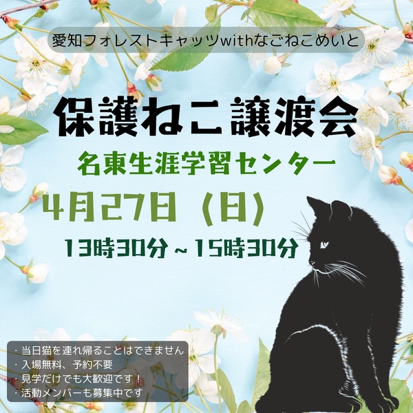| イベント内容 | 日時 4月27日(日) 13:30〜15:30 場所 名東生涯学習センター 主催 愛知フォレストキャッツwithなごねこめいと 地域猫活動やTNR活動の過程などで 保護した猫たち 子猫もいれば、大人猫もいます 見学、相談だけでも大丈夫! 予約不要、参加費無料なのでお気軽に 猫に関する活動を何かしたい、という方も歓迎です 遊びに来る感覚で、お越しくださいませ |
