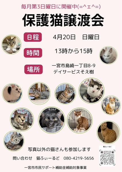 団体で保護している猫たちの里親募集をしています。これから猫を飼いたいとお考えの方や譲渡会を見てみたい方のお越しをお待ちしております。