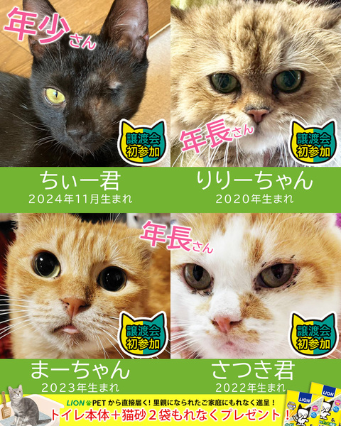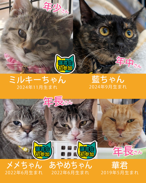 | イベント内容 | 譲渡会参加ねこが決まりました! 元気いっぱい♪甘えん坊♪抱っこ好きの猫20匹です♪お楽しみに~♪ GWはお家でゆっくりもいいですが、猫を見に来て楽しんでください! 猫に触れます!好きなだけ抱っこできます! ■2025年5月4日(日)10時~15時 ■みよし市カリヨンハウス(みよし市三好丘2-2-1) ■無料P48台、大型コインPあり [参加猫一覧] http://miyoshineko.sblo.jp/article/191332898.html 【参加団体】 NPO法人三好ネコの会 https://www.instagram.com/miyoshineko あいち東郷ねこの会 https://www.instagram.com/togoneko 猫暖心 https://www.instagram.com/nekodangonet 【ご来場前に】 ・猫は先着や申入れの順番ではございません。 ・適正と条件を十分考慮させて頂き、トライアル先は抽選で決まります。 ・当選されたご家庭のみに当日電話連絡を差し上げます。 ・体調不良等で不参加になる猫もございます。 ●子猫譲渡手数料 ワクチン1回接種/1匹20,000円・2匹38,000円 ワクチン2回接種/1匹30,000円・2匹58,000円 ●成猫/オス30,000円・メス35,000円 ※成猫は不妊去勢済、ワクチン済です。 ※個人参加猫、他団体猫は上記手数料ではございません。 主催:NPO法人三好ネコの会 https://miyoshi-neko.jp ◎インスタ本館 https://www.instagram.com/miyoshineko ◎インスタ別館 https://www.instagram.com/miyoshi_neko77 <もったいないを保護猫に> ご家庭で余っているフードを譲渡会場でお受け取りできます。 買ったけど食べてくれない、飼い猫が亡くなって残ってしまったなど キャットフードドライブにご寄贈をお願いします。 |