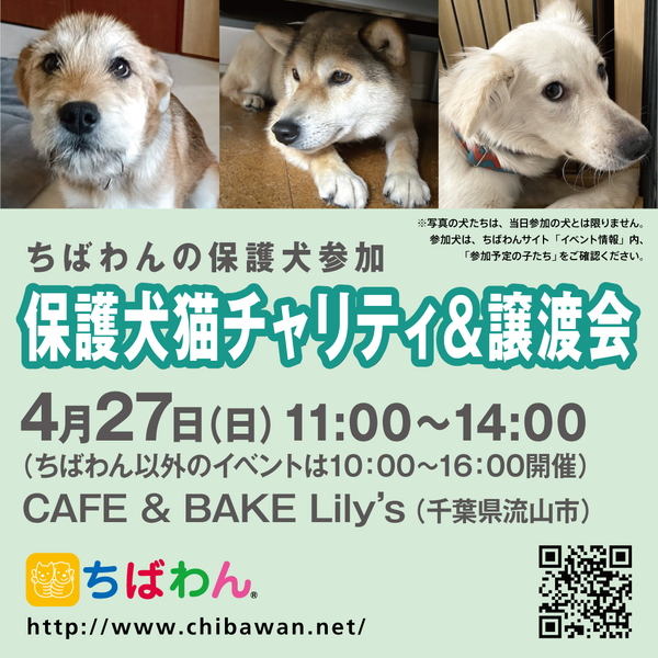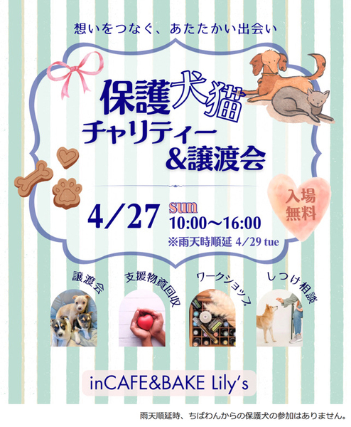 | イベント内容 | CAFE & BAKE Lily’sさん主催の保護犬猫チャリティ&譲渡会にちばわんの保護犬達が参加します。 ※ちばわんからは犬のみが参加します。 <譲渡会開催ご案内> 【日時】4月27日(日)11:00〜14:00 (イベントは10:00〜16:00です) 【場所】CAFE & BAKE Lily’s / 千葉県流山市西初石4-353-7 【会場情報】Instagram @lilys_cafe25 【駐車場】店舗より2軒隣に駐車場あり ◆ご予約なしで参加いただけます。 ◆会場ではチャリティグッズを販売します。 ◆臆病な性格の犬や、子供さんを苦手とする犬も参加しています。いきなり触ったりせず、まずボランティアに声をかけてください。 ◆臆病な性格の犬や、子供さんを苦手とする犬も参加しています。いきなり触ったりせず、まずボランティアに声をかけてください。 ◆イベントバナーに写真が掲載されている犬が参加するとは限りません。参加犬は本サイトに順次掲載されますのでそちらをご確認ください。 イベントホームページ https://chibawan.net/event_other/20250427-lilys-joutokai ちばわんホームページ https://chibawan.net/ |