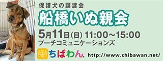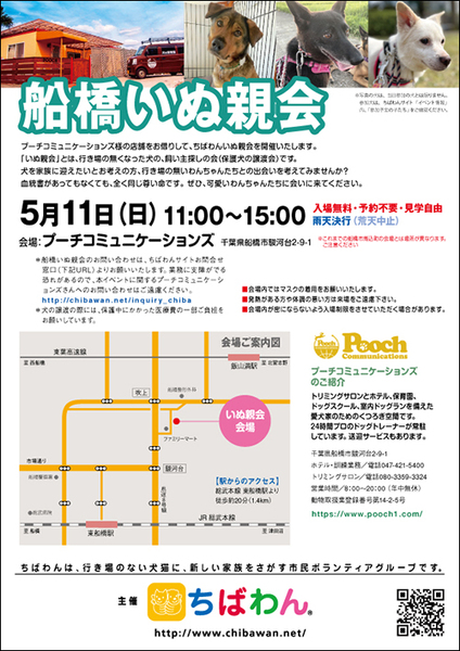 | イベント内容 | 5月船橋いぬ親会のご案内です。 poochさんのご厚意により、プーチコミュニケーションズ(船橋市駿河台)のドッグランをお借りして「船橋いぬ親会」を開催することになりました。 屋根付きのドッグランでの開催になります。 【ちばわんからのお願い】 ①会場内ではマスクの着用をお願いします。 ②発熱がある方や体調が悪い方は来場をご遠慮ください。 ③会場内が密にならないよう入場制限をさせていただく場合があります。 開催日:5月11日(日)11:00~15:00 屋外開催(屋根付きドッグラン) 小雨決行 場所:プーチコミュニケーションズ 千葉県船橋市駿河台2-9-1 【アクセス】 飯山満駅から徒歩約20分 JR東船橋駅から徒歩約20分 県道8号線 吹上交差点~駿河台交差点間にあるファミリーマートの裏手になります。 リサイクルショップとファミリーマートの間の道へ進み、最初のT字路を左折してください。 ※店舗の駐車場は5台分のみとなりますので混雑時にはご利用いただけない場合がございます。 満車の場合はコインパーキングをご利用下さい。 《お知らせ》 ◆会場ではチャリティグッズを販売します 売上金は保護した犬猫の医療費など、 ちばわん活動費として大切に使わせていただきます 《お問い合わせ》 いぬ親会について:http://chibawan.net/inquiry_chiba ※いぬ親会当日はメールが見られません。また、お問い合わせの際は、必ず「具体的な件名」を入れて多数の迷惑メールと区別がつくようにお願いいたします。 ※本イベントに関するPoochさんへのお問い合わせはご遠慮ください。 船橋いぬ親会イベントホームページ https://chibawan.net/event/20250511-funabashi-dog ちばわんホームページ https://chibawan.net/ |