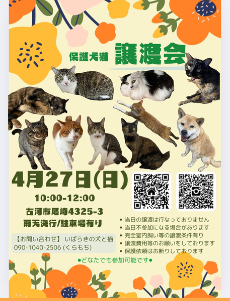 | イベント内容 | 保護犬猫を家族に迎えてみませんか? ずっとのおうちを待っています.* 迎えたい方も会ってみたい方もどなたでも大歓迎です♪ 保護っ子 元気いっぱいお待ちしております!! 予約不要/雨天決行/駐車スペース有 (開催場所が分かりにくいので下記の連絡先までご連絡頂ければご案内致します) ※譲渡条件などありますので当会の里親募集ページやHPをご確認ください※ 【不要になったフード(未開封).タオル.ペットシートなどありましたら、ご寄付いただけると助かります】 ⚫︎お問合せ⚫︎ 電話▷090-1040-2506 (クラモチ) LINE ID▷ 717217 (モトハシ) |