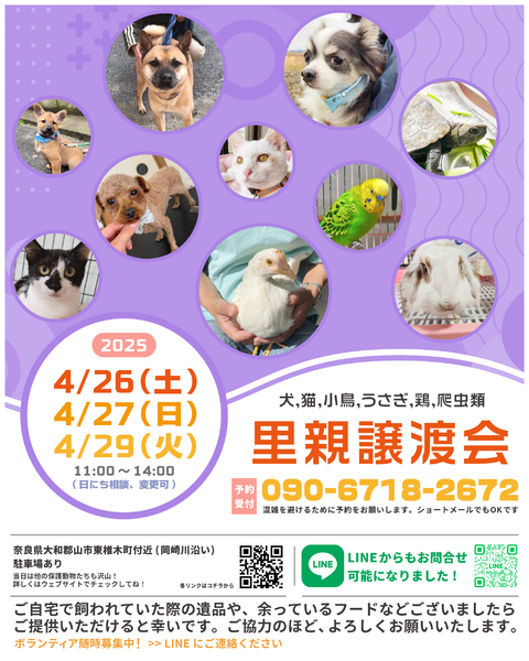 | イベント内容 | \譲渡会を開催します/ 子犬や子猫、小型犬から大型犬、かわいい猫ちゃんたちまで、たくさんの保護犬・保護猫が皆さんを待っています! 写真だけでは伝えきれない魅力が盛りだくさんなので、ぜひお気軽に足を運んでくださいね。 【里親募集中の犬猫情報はコチラ】 https://satoya-boshu.net/foster/?@button_name@=search&FosterParent_MemberID=85262 ●事前にお電話かショートメールでご予約をお願いします。 ・予約番号:090-6718-2672 ●ご希望の犬猫がいましたら、予約時に名前をお伝えください。 ●当日までに譲渡が決定した・体調がすぐれないなど、やむを得ない理由で急きょ不参加の場合があります。ご了承ください。 ●その場での引き渡しはしておりません。譲渡決定後、距離にかかわらずこちらからお届け致します。 みなさまのご来場をお待ちしております! ?りぼんは、奈良県で活動している動物保護団体です。 犬・猫・うさぎなどの小動物・インコやニワトリなどの鳥・両生類・爬虫類など動物種を問わず、お届け先も地域を問わず、動物たちと里親さまをつなぐ活動を行っています。 ◎ホームページ https://ribbon-foster.jimdofree.com/ ◎公式YouTube https://www.youtube.com/@ribbon-shelter https://www.instagram.com/ribbon_shelter/ |
