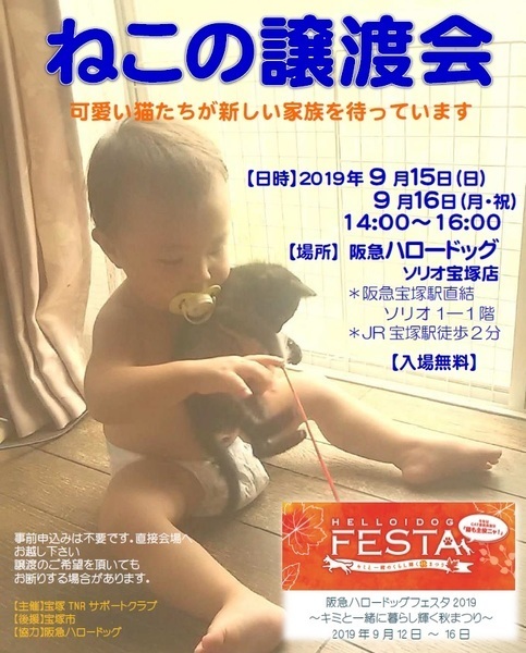 | イベント内容 | 生後3~4ヶ月の子猫、成猫など参加予定。 【日時】2019年9月15日(日) ・16日(月/祝) 14:00~17:00 【場所】阪急ハロードッグ・ソリオ宝塚店内 阪急宝塚駅直結 ソリオ1-1F JR宝塚駅 徒歩2分 【問合せ】宝塚TNRサポートクラブ kaizaru7★yahoo.co.jp(★を@に変えて下さい) ※ 予約不要 ※ 直接会場へお越し下さい。 皆さまのご来場をお待ちしています。 https://ameblo.jp/takarazuka-tnr/ |