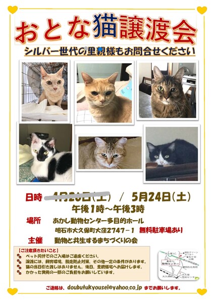 | イベント内容 | 1歳から13歳くらいまでのおとなの猫だけの譲渡会です。 今後の飼育のめどがつかない単身高齢者の猫、公園でご飯をもらってきた猫、多頭飼育崩壊から行政機関に何年も収容されていた猫等々、みんなボランティアさんの保護猫となり切実に新しいお家を求めています。 |