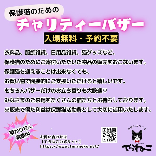 | イベント内容 | 掲載が追いついておりませんが、子猫から成猫まで、たくさんの猫ちゃんが参加します。 最新情報はInstagramで発信しています‼️ てらねこ譲渡会は、江戸川区で活動するボランティアを中心に、季節のお花に囲まれた美しいお寺、城立寺様のご協力の下、開催しています。 単身者、高齢者の方など、なかなかお迎えが叶わない方もご相談ください。 子猫から成猫までたくさんの可愛い猫ちゃんが参加します(体調不良の場合、予告なく不参加になる場合があります) 【第12回 てらねこ譲渡会】 日時:2025年5月18日(日) 14:00~17:00 (受付13:45/最終受付16:30) 会場:城立寺 住所:江戸川区春江町2-39-28 https://maps.app.goo.gl/rE7j8HNxzK1VV3rAA?g_st=com.google.maps.preview.copy ・公共機関でお越しの場合 都営新宿線「瑞江駅」から徒歩12分 JR小岩駅から京成バス「小76」 バス停「名主屋敷」から徒歩すぐ ※敷地内に駐車スペースがあります(満車の際は近隣にコインパーキングもあります。 |