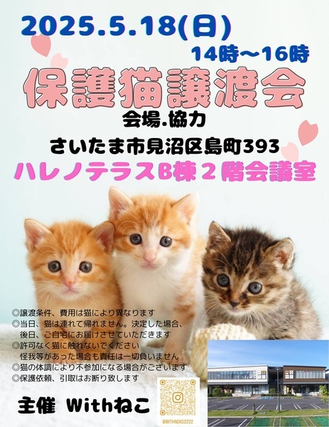 | イベント内容 | 2024年に生まれた子猫たちもまだまだしあわせにゃんこになる日を待っています ☆参加予定猫についてはこちらをご覧ください→https://youtu.be/u20lwwEp8bY ※当日、猫の体調・里親決定の場合は不参加になる場合がございます さいたま市近郊で活動している個人ボランティアさんが参加する 冷暖房完備の会議室をお借りして区切られたお部屋で ゆっくり猫と触れ合える環境でのアットホームな譲渡会です 大切に育ててきた子猫から大人猫までが参加します 入場は無料です ☆2019年3月より開催しております こちらの会場で しあわせにゃんこになった数は 400匹以上です ☆一匹一匹清潔な環境で丁寧に健康管理に気を付けて育てています※必要医療は全てかけています ☆里親様のご年齢により 高齢の猫の譲渡も行っています ☆初めて猫を飼う方でも不安がないよう アドバイスさせていただきます 【ご支援のお願い】 おうちで購入したけど食べなかったキャットフード・ペットシート・猫砂等ございましたら お持ちいただければ助かる命があります。ご協力お願いいたします 協力・会場 http://hare-terra.com/ ハレノテラスB棟 2階会議室【無料駐車場320台】 所在地 埼玉県さいたま市見沼区島町393番地 交通 【お車でお越しの方】 東大宮バイパスからのルート 東大宮バイパスを進み、「深作中」交差点を曲がり、見沼区島町(ハレノテラス)へ 県道5号線(新産業道路)からのルート 県道5号線を進み、「八雲神社入口」交差点を曲がり、さらに進み「東大宮駅入口」を曲がり、見沼区島町(ハレノテラス)へ※島小学校向かい 【電車でお越しの方】 JR宇都宮線(湘南新宿ライン・上野東京ライン)東大宮駅「東口」下車 駅前通りをまっすぐ徒歩13分 【バスでお越しの方】 JR宇都宮線東大宮駅東口より 国際興業バス「大和田駅行き」3分乗車 「東大宮7丁目」バス停 下車徒歩3分 東武野田線大和田駅 国際興業バス「東大宮駅行き」6分乗車 「東大宮7丁目」バス停下車 徒歩3分 ※お見合いをして 譲渡後希望の場合は会場で申し込みをし 譲渡条件と照らし合わせ 決定の場合は 後日 ご自宅へお届けし 譲渡契約を結んでいただきます ※医療費・光熱費の一部等は 譲渡費用のご負担がございます 次の子の保護に使わせていただきます ※猫の飼育に必要な ゲージなどのご購入・脱走防止対策等をお願いします ※購入したけどおうちの猫ちゃんが食べなかったフード・使わなかった猫砂・ペットシート ご支援大歓迎です 主催・お問い合わせ Withねこ https://nekotomo.localinfo.jp Youtube https://www.youtube.com/@withneko2222 Instagram https://www.instagram.com/withneko2222 |