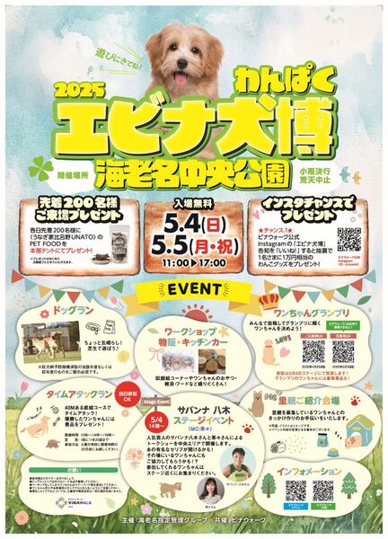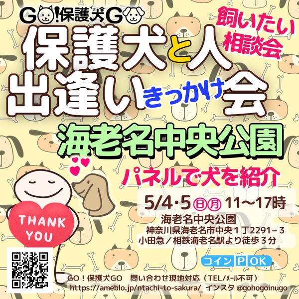 | イベント内容 | 保護犬と出逢うきっかけの会 エビナ犬博内で、パネル展を開催します 募集中の犬は数頭がいますが海老名市への施設の届出内容により、犬の展示ができません。 質問は何でも受け付けます。この機会に聞いてくださいね 詳細は GO!保護犬GO https://ameblo.jp/ntachi-to-sakura/ をご覧くださいませ |