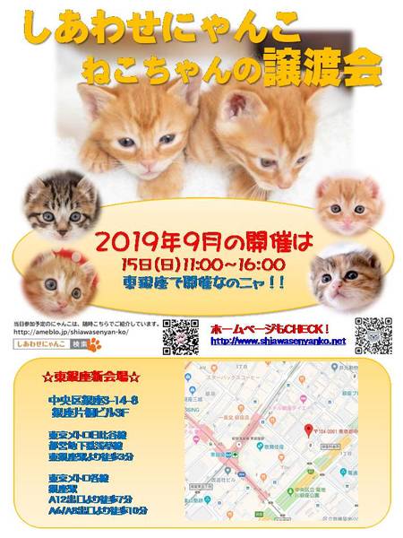 | イベント内容 | しあわせにゃんこは行き場のない猫ちゃんと里親様との出会いの場を提供するグループです♪ 子猫も成猫もハンデのある猫もみんな新しい家族を待っています♪ みなさまのご来場を保護主、スタッフ一同心よりお待ちしております♪ ◆開催日/開催時間◆ 2019年9月15日(日) 11:00~16:00 ご希望の猫ちゃんがいらっしゃる場合は11時30分までに受付をお願い致します。 複数のお申し込みがある場合は11時30分で受付を終了させて頂く場合がございます。 受付をされた全ての里親様とお見合いをさせて頂きます。 ※先着順ではございません ※当日、猫ちゃんを連れて帰ることは出来ません。後日、保護主が里親様宅へお届けいたします。 ◆会場◆ 東京都中央区銀座3-14-8 片桐ビル 3階(階段をご利用下さい) ※詳しいアクセスはHPをご覧下さい http://www.shiawasenyanko.net/jyoutokai.html ◆交通手段◆ 東京メトロ各線 銀座駅 A12出口徒歩6分 東京メトロ日比谷線 東銀座 A5出口徒歩2分 都営浅草線 東銀座 A5出口徒歩2分 ※お車でご来場の際、駐車場のご用意はございません。 近隣のコインパーキング等をご利用ください。 いつ里の掲載参加猫一覧はこちらから https://satoya-boshu.net/mypage/foster_list.php?@ps@=none アメーバブログの里親募集にゃんこはこちら https://ameblo.jp/shiawasenyan-ko/entry-12494061041.html?frm=theme ◆猫ちゃんとのお見合い◆ 掲載している猫ちゃんは基本的に譲渡会場でのお見合いのみとなります。 譲渡会への参加が決定している猫ちゃんはその譲渡会で里親様が決定しなかった場合のみ保護主宅でのお見合いが可能となります。 自宅お見合いを希望される里親様はメール(info@shiawasenyanko.net)にてご相談ください。 ◆当譲渡会では猫ちゃんと里親様のスキンシップを大切にしています◆ 新しい家族として20年以上いっしょに暮らしていく猫ちゃんです。 譲渡会場でたくさんの猫ちゃんと触れ合って良きパートナーを見つけてください。 はじめて猫ちゃんを迎える不安や先住猫ちゃんとのトライアルの注意点、猫ちゃんと里親様の暮らし方など気軽にご相談ください。 経験豊富な保護主や猫大好きスタッフがアドバイスさせていただきます。 ◆子猫ご希望の里親様◆ 子猫は急な下痢や発熱等により体調が急変し、数時間対応ができなかっただけでも命を落とす事があります。 その為、当譲渡会では月齢によりお留守番のない又は少ないご家庭への譲渡に限らせて頂いております。 また里親様と子猫ちゃんが安心してトライアル期間を過ごせるよう体重が1㎏程になってからのお届けとさせて頂いております。 ◆里親希望のみなさまへ◆ ご家族の皆様で生涯、家族の一員としてたっぷり愛情を注いでくださるご家庭をお待ちしております。 恐れ入りますが ・独身、単身者の方 ・友人同士、同棲でのお住まいの方 ・高齢者のみのご家庭の方 ・脱走防止対策にご協力頂けない方 はご希望に添えない場合もございますのでご了承下さい。 ※詳しくはその他連絡事項をお読みください。 ◆ご負担頂く費用について◆ 譲渡の際に譲渡負担金(医療費の一部、譲渡金、お届け時の交通費)を里親様にご負担頂く事により 過酷な状況にいる猫ちゃんを保護し新しいご家族の元へ送り出す事ができています。 皆様のご理解とご協力にボランティア一同、心より感謝しております。 ご負担頂く医療費につきましてはホームページに詳しく記載させて頂いております。 http://www.shiawasenyanko.net/onegai.html しあわせにゃんこホームページ http://www.shiawasenyanko.net メールでのお問い合わせ info@shiawasenyanko.net |