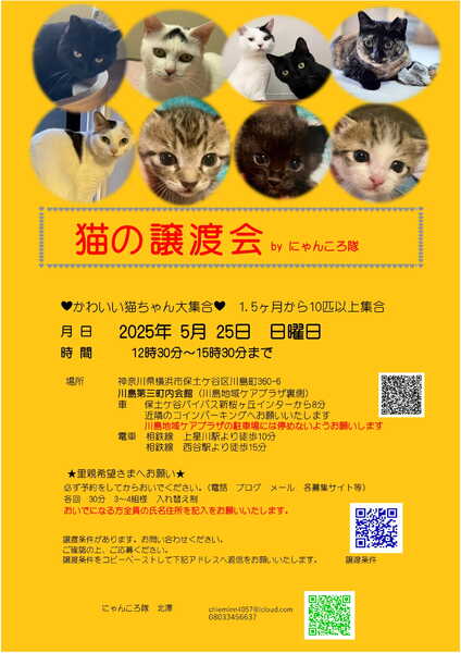| イベント内容 | 猫ちゃんの譲渡会を開催いたします。 1.5ヶ月位からの猫さん10匹以上 大人猫さんも参加です。 月 日 2025年 5月25日 日曜日 時 間 12時30分~15時30分まで 場所 神奈川県横浜市保土ケ谷区川島町360-6 川島第三町内会館(川島地域ケアプラザ裏側) 車 保土ケ谷バイパス新桜ヶ丘インターから8分 近隣のコインパーキングにお願いいたします。 (手前にある川島地域ケアプラザの駐車場には停めないでください) 電車 相鉄線 上星川駅より徒歩10分 相鉄線 西谷駅より徒歩15分 ★里親希望さまへお願い★ 必ず予約をしてからおいでください。 各回 30分 3~4組様 おいでになる方全員の氏名住所を記入をお願いいたします。 譲渡条件があります。お問い合わせください。 ご確認の上、ご応募ください。 猫の譲渡について http://nyankorotai.blog.fc2.com/blog-category-5.html 上記の譲渡条件をコピーペーストして下記アドレスへ送ってください。 追ってご連絡いたします。 お電話にても受付いたします。 下記の譲渡条件を送ってくださっても大丈夫です。 ◆ご応募時に下記事項をお知らせください◆ 1.お名前、簡単な住所 2.先住動物の有無(ワクチン 不妊手術の有無等)と選んだ理由 3.家族構成(家族全員の年齢 関係 お仕事等) 4.住宅環境(一戸建て 分譲マンション 一戸建て賃貸 賃貸マンションペット可) 5.留守番の時間 6.下記の①~⑨までの同意 ◆応募者様へのお願い◆ ①一生涯、家族の一員としてくださる事(猫は20年生きます) ②完全室内飼いでお願いします。 (脱走防止対策をお願いします。ケージ 脱走防止扉 玄関窓等) ③不妊手術及び毎年のワクチン接種など健康管理 (不妊手術済のご連絡は必須) ④家族全員の同意があること ⑤ペット可住宅にお住まいであること。 (ペット不可にお住まいの方には譲渡できません) ⑥身分証明の提示及び誓約書を記入していただきます。 ⑦譲渡後の近況報告をしていただける方 ⑧譲渡費用等をご負担できる方 (初期医療行為は済ませてお届けします) ⑨ほとんどの猫さんがお外から保護した子です。 その辺の事をご理解していただける方 猫が小さい場合はお留守番の短い家を希望します。 ケージのご用意をお願いいたします。 申し訳ありませんが先住動物さんが4匹以上のご家庭はお断りさせていただいております。 無職 学生 未成年の方からの申込は受け付けておりません。 ご家族に未就学児のいるお家及び高齢者の方は要相談 2匹一緒を優先させていただきます。 双方の条件が合った場合は譲渡会又は保護先にお見合にきていだだき成立後に自宅室内へお届けいたします。 この時期なので近くに方を優先させていただく事もあります。 ご予約お待ちしております。 にゃんころ隊 http://nyankorotai.blog.fc2.com 担当 北澤(にゃんころ隊) chieminn4057@icloud.com |