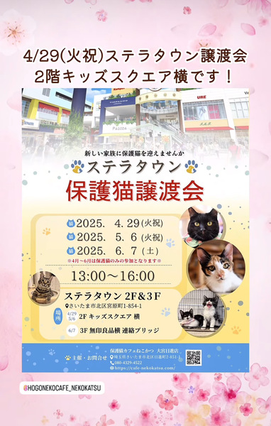 | イベント内容 | *保護猫讓渡会* 日時:5/6(火・祝) 13時~16時 場所:ステラタウンさま ステラタウンさま譲渡会に参加予定です。 センターからの引き出し、飼育崩壊や所有権放棄などで、生きる場所を失った猫たちが、最大限の医療にかけてピカピカになりました。 写真の猫の他にも甘えっこちゃんたちが、溢れる笑顔でお待ちしています。 ぜひご参加ください。 ***譲渡条件*** *完全室内でお願いします。 *逸走防止対策にご協力頂ける方 *写真付きの身分証をご提示頂ける方 *LINE若しくはメールでのやりとりが可能な方 *譲渡に関する覚え書きにご署名頂ける方 *初期医療費をご負担頂ける方 *その他の譲渡条件を、譲渡会場でお話させて頂ける方 *猫が生まれた年から20年後に、80歳を超えていない方 *お一人暮らしの方は、後見人さまのご同席が必要です |