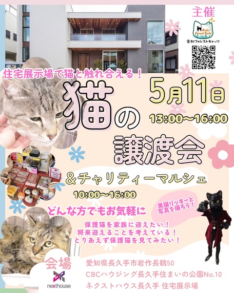 | イベント内容 | 日時 5月11日(日) 10:00〜16:00 ※譲渡会は13:00〜16:00 場所 CBCハウジング長久手住まいの公園 No.10 ネクストハウス住宅展示場 https://nexthouse.jp/next/event/nagakute_cat/ 主催 愛知フォレストキャッツ 地域猫活動やTNR活動の過程などで 保護した猫たち 子猫もいれば、大人猫もいます 見学、相談だけでも大丈夫! 予約不要、参加費無料なのでお気軽に 猫に関する活動を何かしたい、という方も歓迎です 遊びに来る感覚で、お越しくださいませ |