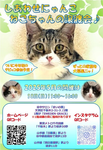 | イベント内容 | 「しあわせにゃんこ」は行き場のない猫ちゃんと里親様との 出逢いの場を提供するグループです♪ 子猫も成猫もハンデのある猫もみんな新しい家族を待っています♪ みなさまのご来場を保護主、スタッフ一同心よりお待ちしております♪ 詳しくはホームページ譲渡会情報をご確認願います。 http://www.shiawasenyanko.net ついに今年初のチビッコ参加予定♪ ◆開催日/開催時間◆ 2025年5月18日(日) 11:00~16:00 ご希望の猫ちゃんがいらっしゃる場合は11時30分までに受付をお願い致します。 複数のお申し込みがある場合は11時30分で受付を終了させて頂く場合がございます。 受付をされた全ての里親様とお見合いをさせて頂きます。 ※先着順ではございません。 ※当日、猫ちゃんを連れて帰ることは出来ません。 後日調整のうえ保護主が里親様宅へお届けいたします。 ◆会場◆ 受付はまいの間1階です♪ ※お店の奥に会場への階段がございます♪ 譲渡会場:東京都文京区千駄木2-31-3 1階が北欧雑貨ショップ「SWEDENGRACE」 2階が谷中サロン「まいの間」 ※詳しいアクセスはホームページをご覧下さい http://www.shiawasenyanko.net 谷中サロン「まいの間」の情報はこちら http://neko-to-kyo.com/#maima ◆交通手段◆ 東京メトロ千代田線「千駄木」駅より徒30秒 JR山手線「西日暮里」駅より徒歩11分 JR山手線「日暮里」駅より谷中銀座経由で徒歩13分 ※お車でご来場の際、駐車場のご用意はございません。 近隣のコインパーキング等をご利用ください。※近隣に沢山あります。 いつ里の掲載参加猫一覧はこちらから https://satoya-boshu.net/mypage/foster_list.php?@ps@=none アメーバブログの里親募集にゃんこはこちら https://ameblo.jp/shiawasenyan-ko/theme-10092719565.html ◆猫ちゃんとのお見合い◆ 掲載している猫ちゃんは基本的に譲渡会場でのお見合いのみとなります。 譲渡会への参加が決定している猫ちゃんはその譲渡会で里親様が決定しなかった場合のみ保護主宅でのお見合いが可能となります。 自宅お見合いを希望される里親様はメール(info@shiawasenyanko.net)にてご相談ください。 ◆当譲渡会では猫ちゃんと里親様のスキンシップを大切にしています◆ 新しい家族として20年以上いっしょに暮らしていく猫ちゃんです。 譲渡会場でたくさんの猫ちゃんと触れ合って良きパートナーを見つけてください。 はじめて猫ちゃんを迎える不安や先住猫ちゃんとのトライアルの注意点、猫ちゃんと里親様の暮らし方など気軽にご相談ください。 経験豊富な保護主や猫大好きスタッフがアドバイスさせていただきます。 ◆子猫ご希望の里親様◆ 子猫は急な下痢や発熱等により体調が急変し、数時間対応ができなかっただけでも命を落とす事があります。 その為、当譲渡会では月齢によりお留守番のない又は少ないご家庭への譲渡に限らせて頂いております。 また里親様と子猫ちゃんが安心してトライアル期間を過ごせるよう体重が1㎏程になってからのお届けとさせて頂いております。 ◆里親希望のみなさまへ◆ ご家族の皆様で生涯、家族の一員としてたっぷり愛情を注いでくださるご家庭をお待ちしております。 下記に該当する希望者様へ ・独身、単身者の方 ・友人同士、同棲でのお住まいの方 ・高齢者のみのご家庭の方 は、ご相談の上、譲渡を判断させて頂きます ・適正飼育の不可能な方 ・脱走防止対策を考えて頂けない方 ・定期報告の不可能な方 は、ご遠慮下さいますようお願い致します ◆ご負担頂く費用について◆ 譲渡の際に譲渡負担金(医療費の一部、譲渡金、お届け時の交通費)を里親様にご負担頂く事により 過酷な状況にいる猫ちゃんを保護し新しいご家族の元へ送り出す事ができています。 皆様のご理解とご協力にボランティア一同、心より感謝しております。 ご負担頂く医療費につきましてはホームページに詳しく記載させて頂いております。 http://www.shiawasenyanko.net/onegai.html しあわせにゃんこホームページ http://www.shiawasenyanko.net メールでのお問い合わせ info@shiawasenyanko.net |