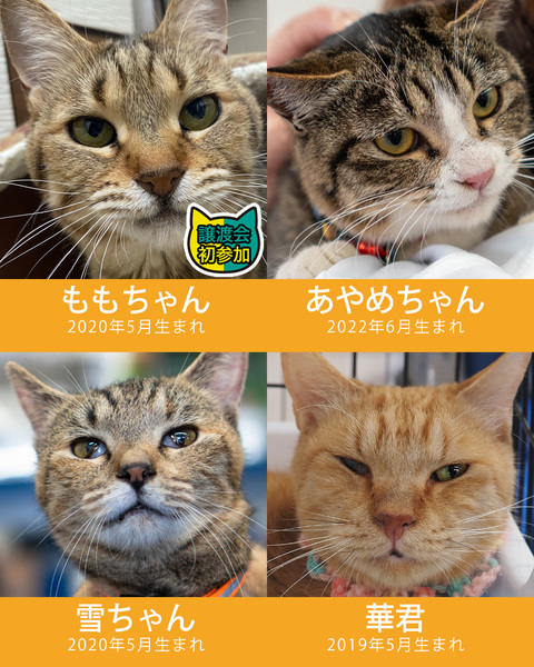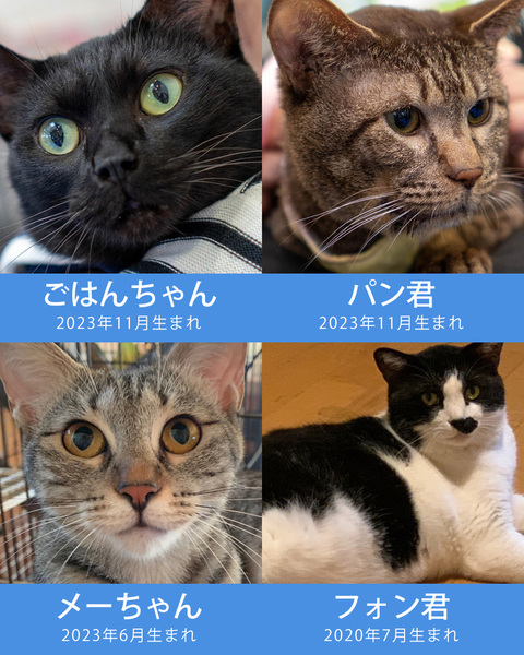 | イベント内容 | 譲渡会参加猫が決まりました♪ 小さいのから大きいのまで20匹参加します☆ 垂れ耳がかわいいスコティッシュ系の「そら君」大人気!? じっくり考えたい方は朝一がオススメ!ゆっくり見学は午後がオススメ! ▼参加猫▼ http://miyoshineko.sblo.jp/article/191349742.html ■2025年5月18日(日)10時~15時 ■みよし市カリヨンハウス(みよし市三好丘2-2-1) ■無料P48台、大型コインPあり ※野菜マルシェさんと合同開催 【参加団体】 NPO法人三好ネコの会 https://www.instagram.com/miyoshineko あいち東郷ねこの会 https://www.instagram.com/togoneko 猫暖心 https://www.instagram.com/nekodangonet 【ご来場前に】 ・猫は先着や申入れの順番ではございません。 ・適正と条件を十分考慮させて頂き、トライアル先は抽選で決まります。 ・当選されたご家庭のみに当日電話連絡を差し上げます。 ・体調不良等で不参加になる猫もございます。 ●子猫譲渡手数料 ワクチン1回接種/1匹20,000円・2匹38,000円 ワクチン2回接種/1匹30,000円・2匹58,000円 ●成猫/オス30,000円・メス35,000円 ※成猫は不妊去勢済、ワクチン済です。 ※個人参加猫、他団体猫は上記手数料ではございません。 主催:NPO法人三好ネコの会 https://miyoshi-neko.jp ◎保護猫一覧 https://miyoshi-neko.jp/foster_parents.html ◎インスタ本館 https://www.instagram.com/miyoshineko ◎インスタ別館 https://www.instagram.com/miyoshi_neko77 <もったいないを保護猫に> ご家庭で余っているフードを譲渡会場でお受け取りできます 買ったけど食べてくれない、飼い猫が亡くなって残ってしまったなど キャットフードドライブにご寄贈をお願いします。 |
