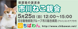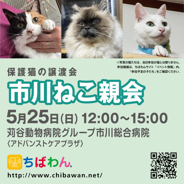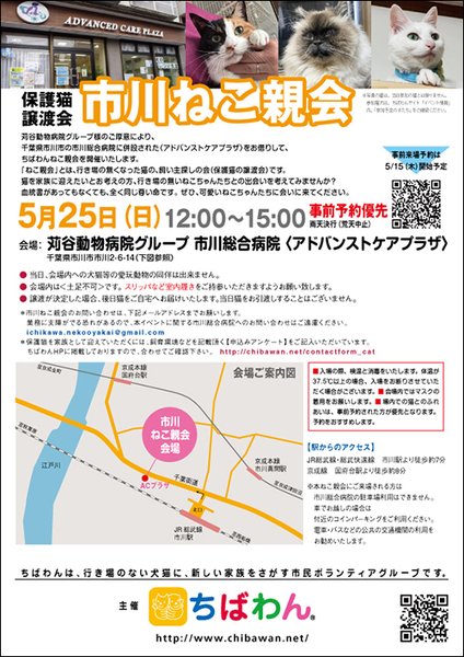 | イベント内容 | 苅谷動物病院様のご厚意により、千葉県市川市の市川総合病院にに併設された<アドバンストケアプラザ>をお借りして、「ちばわんねこ親会」を開催いたします。 是非カワイイねこたちに会いに来てください♪ ※場内でのねことのふれあいは、事前予約された方が優先となります。ご予約をおすすめします。事前来場予約は05月15日(木)開始予定です。 ちばわんねこ親会 ご来場予約フォーム https://docs.google.com/forms/d/e/1FAIpQLSflPDIHZFu7Q0OnNaop8nJEU48FOyTpgtFEsTRGJkQgLT2KAA/closedform ※会場は土足禁止です。室内履きをご持参ください。 ※ポスターの猫が参加するとは限りません。参加猫に関してはHPのイベント情報をご覧ください。 ※会場への直接のお問い合わせはご遠慮ください。 開催日 2025年05月25日(日)12:00〜15:00 場所 苅谷動物病院グループ 市川総合病院 <アドバンストケアプラザ> 〒272-0034 千葉県市川市市川2-6-14 アクセス JR総武線・総武快速線 市川駅より約徒歩7分 京成線 国府台駅より約徒歩8分 ※ねこ親会にご来場される方は市川橋病院の駐車場は利用できません。 車でお越しの際は、付近のコインパーキングをご利用ください。 路上駐車は絶対にお止めください。 駅からも近い場所ですので電車・バスなどの公共の交通機関の利用をお勧めいたします。 注意事項 室内での開催ですが、当日荒天の場合は中止いたします。 微妙なお天気、または中止の場合は朝8時までにこちらでお知らせいたします。 なお、当日に個別でのメール連絡はできかねます。 【会場内でのお願い】 ・当日、会場内への犬猫等の愛玩動物の同伴は出来ません。 ・会場内は<土足不可>です。スリッパなど室内履きをご持参いただきますようお願い致します。 ・譲渡が決定した場合、後日猫をご自宅へお届けいたします。当日猫をお引渡しすることはございません。 【当日の流れ】 ①家族募集中のねこと会いたい方はどなたでも自由にご参加いただくことができます。ちばわんボランティアは名札をつけておりますのでどうぞご遠慮なくお声をおかけください。 また、募集中のねこのそばには預かりボランティアが控えておりますので遠慮なくご質問ください。 ②気に入ったねこがいましたら、該当の預かりボランティアとお話しのうえ、「申し込みアンケート」にご記入ください。 (前日までにメールでアンケートを送信してお申し込みいただくこともできます) ◆「ねこ」アンケート送信先:【ねこ親】お申込みアンケート https://chibawan.net/contactform_cat ③アンケート内容を拝見し、アンケート担当者がお話しさせていただきます。 ④原則として一両日中に預かりボランティアからお返事の連絡をさせていただきます。 ⑤ご縁が成立した場合は後日、こちらからご自宅までねこをお届けし、約1ヶ月のお試し生活に入っていただきます。 お届けの際に書面での譲渡契約書を交わします。 ※ワクチン・去勢不妊手術・マイクロチップなど保護ねこにかかった費用は家族になるねこ親様にもご負担をお願いしています。 【お願い】 ①ねこ親会・いぬ親会当日の飛び入り参加が受け付けておりません。 犬猫を保護した、飼い主を失った犬猫がいる、新しい家族を探したい犬猫がいるなどの場合は「こんな時どうする?」をお読みください。 ◆こんな時どうする? ②会場は室内ですが、脱走逸走の恐れがあるため、ねこはケージから出さないでください。 (ご希望のねこに触れてみたいなどのご希望がございましたらお近くのちばわんボランティアにお声をおかけください) ③参加するねこの中には臆病な性格の仔がいます。お子様だけでの入場はご遠慮いただきます。お怪我防止のためにご理解ください。 今後も問題なくねこ親会を続けられるよう皆様のご協力をお願いいたします。 お知らせ 〇会場でちばわんグッズを販売いたします。 |