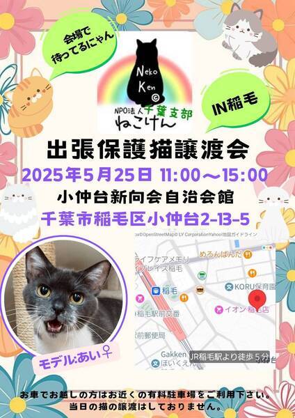 | イベント内容 | 5月も出張譲渡会を開催します♪ 子猫からシニア猫まで、沢山の保護猫達が譲渡会に参加します。 ブログにて、譲渡会に参加する猫さん達を紹介しております。 ねこけん千葉支部ブログ→ https://ameblo.jp/nekoken-chiba/ 通常スタイルの譲渡会と致しますが、コロナウイルス/インフルエンザ対策として ・入退室の際は消毒をお願い致します。 ・ご予約無しでお越しいただけますが、混雑時は整理券を配らせていただきます。 ご協力の程よろしくお願い致します。 また、譲渡会会場では、千葉県内にお住いの預かりボランティアさん及びお世話ボランティアさんを募集しています。 ご希望の方は、大変お手数をおかけしますが、譲渡会までお越しください。 ※ご都合がつかない場合は、お問い合わせ先までご相談ください。 [日時] 5月25日(日)11:00~15:00 [会場] 千葉県千葉市稲毛区小仲台2-13-5 小仲台新向会自治会館 (イオン稲毛店様 立体駐車場入り口から徒歩1分) ※屋内での開催となり雨天決行です。 ※抱っこもOK! ※猫ちゃんの負担も考え、ご来場は時間内にお願い致します。 ※特にご予約などは必要ございませんのでご家族皆様でぜひお越し下さい。 [交通] 交通機関を利用してお越しの方 JR稲毛駅 東口より徒歩5分 お車でお越しの方はお近くの有料駐車場をご利用ください。 [譲渡ご希望の方へのお願い] 誠に恐れ入りますが下記に当てはまります方への譲渡は不可となりますので予めご了承下さい。 ①学生さん、未成年の方、安定収入のない方 ②ペットを飼う事を許されていない住宅にお住まいの方 ③身体的、精神的疾病で治療中の方 ※60歳以上の方は別途条件がございますのでご相談下さい。 [譲渡の流れ] お申込み→審査→後日お届け→トライアル→正式譲渡 ※当日のお連れ帰りは出来ませんので予めご了承ください。 ※仮譲渡時にご希望の猫ちゃんにかかった医療費(ウイルス検査・ワクチン・駆虫・不妊去勢手術等)をご負担願います。 しかし、正式譲渡に至らなかった場合は医療費を全額返済致します。 [主催] 動物愛護団体 NPO法人ねこけん 千葉支部 [ブログ] https://ameblo.jp/nekoken-chiba/ [参加動物] 成猫・子猫 [お問い合わせ] ご不明な点、ご質問等ございましたら下記までお問い合わせください。 chiba.info@nekoken.jp |