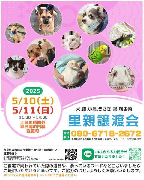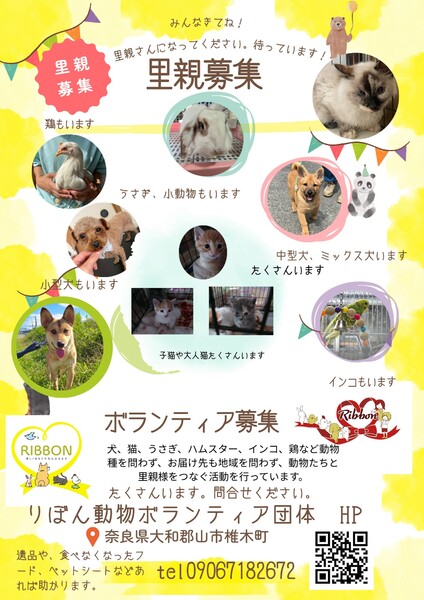 | イベント内容 | \譲渡会を開催します/ 子犬や子猫、小型犬から大型犬、かわいい猫ちゃんたちまで、たくさんの保護犬・保護猫が皆さんを待っています! 写真だけでは伝えきれない魅力が盛りだくさんなので、ぜひお気軽に足を運んでくださいね。 【里親募集中の犬猫情報はコチラ】 https://satoya-boshu.net/foster/?@button_name@=search&FosterParent_MemberID=85262 ●事前にお電話かショートメールでご予約をお願いします。 ・予約番号:090-6718-2672 ●ご希望の犬猫がいましたら、予約時に名前をお伝えください。 ●当日までに譲渡が決定した・体調がすぐれないなど、やむを得ない理由で急きょ不参加の場合があります。ご了承ください。 ●その場での引き渡しはしておりません。譲渡決定後、距離にかかわらずこちらからお届け致します。 みなさまのご来場をお待ちしております! ?りぼんは、奈良県で活動している動物保護団体です。 犬・猫・うさぎなどの小動物・インコやニワトリなどの鳥・両生類・爬虫類など動物種を問わず、お届け先も地域を問わず、動物たちと里親さまをつなぐ活動を行っています。 ◎ホームページ https://ribbon-foster.jimdofree.com/ ◎公式YouTube https://www.youtube.com/@ribbon-shelter https://www.instagram.com/ribbon_shelter/(里親募集中の動物情報) https://www.instagram.com/ribbon_shelter1/(ボランティア日記) |