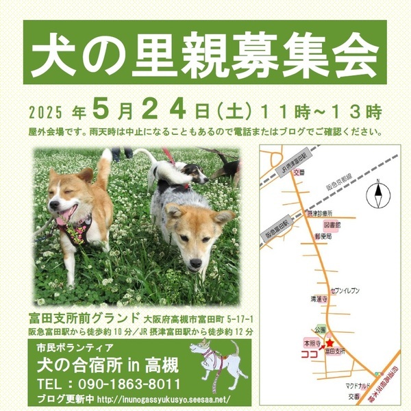 | イベント内容 | ※屋外会場での里親募集会です。 雨天時は中止にする可能性がありますので電話でご確認ください。 犬によっては別会場をご案内できる場合があります。 (電話でのお問合せ→090-1863-8011) ※先住ワンちゃんを連れて会いに来て頂けます。相性を見るためにも、是非是非、連れてきてください。 ※近付きましたら「犬の合宿所in高槻」のブログでも参加予定犬等の情報を紹介していきます。 ➡ http://inunogassyukusyo.seesaa.net/article/515073164.html 予約は不要ですが、参加犬が直前に変更する場合がありますので、特に会いたいワンちゃんが決まっている場合は事前にご確認頂く方が確実かと思います。 【お問合せ】 090-1863-8011 ・・・・・・・・・・ 【アクセス】 ・阪急京都線 富田駅から徒歩約10分 ・JR京都線 摂津富田駅から徒歩約12分 ※隣接する富田支所と公民館の駐車場は使えませんが、会場広場内に駐車できる場合があります。 事前にご確認ください。(090-1863-8011) ・・・・・・・・・・ 市民ボランティア「犬の合宿所in高槻」は、現地での譲渡が難しい離島の保健所収容犬を引き取り関西で新しい飼い主探しをしています。 保護犬を家族として迎えることが文化として定着し、生体販売に伴う悲惨な繁殖犬の存在がなくなることを願っています。 ・・・・・・・・・・・・・・・・・・・・・・・・・・・・・ ★ 一時預かりさんや犬の搬送ボランティアさん、里親募集会の当日お手伝いの方など常時募集しています。 ★犬によっては個別お見合いできる場合があります。 里親募集会に参加できない方で個別お見合いをご希望の方は、預かりさんとの日程調整が必要ですので、電話でお問合せください。⇒090-1863-8011 |