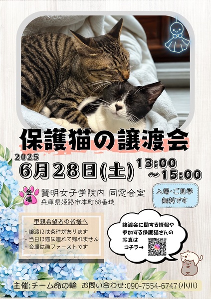 | イベント内容 | 姫路城のそばにある、賢明女子学院にて保護猫の譲渡会を開催いたします。 姫路市近郊のボランティアさんたちの保護猫たちが大集合! ペットベッドや雑貨などのバザーも同時開催いたします。 譲渡会は猫たちのお見合い会場。 気に入った猫がいてお迎えしたい場合は、まずトライアルを行います。 譲渡には条件があるため、そばに立っている保護主さんへ、お声かけください。 当日、猫を連れ帰ることはできません。 保護猫たちは、いつもと違う場所で緊張の中、当日会場に来ております。 ここに来られること自体、献身的なお世話をしている保護主さんの日々の賜物。 猫たちも頑張って会場で、ずっとのおうちとの出会いを待っているので 会場では猫さん最優先での、ご対応お願いいたします (大きな声を上げない・フラッシュ撮影しない等) |