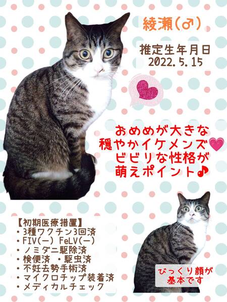 | イベント内容 | 【秘密結社ねこのひげ♡保護猫譲渡会】 5/18(日) 13:00~16:00 埼玉県鶴ヶ島市三ツ木新町1-1-13 カインズ鶴ヶ島店1F カルチャー教室 にて保護猫譲渡会を開催します♪ 脳内はまだまだ仔猫やでー!なオトナ猫が 元気いっぱいで参加します♪ ずっとのご家族さまと 愛し愛されな 両想いになれますように♡ 家族にするなら保護猫だべ♪♪ 新しい家族と笑顔で暮らしたい♪ という方は是非会いにいらしてください♡ ご不明な点がございましたら Instagram @nnnkanto DMにてお問い合わせ下さい☆ |