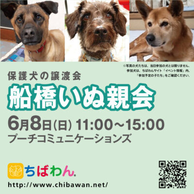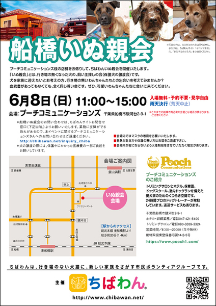 | イベント内容 | 6月船橋いぬ親会のご案内です。 poochさんのご厚意により、プーチコミュニケーションズ(船橋市駿河台)のドッグランをお借りして「船橋いぬ親会」を開催することになりました。 屋根付きのドッグランでの開催になります。 【ちばわんからのお願い】 ①会場内ではマスクの着用をお願いします。 ②発熱がある方や体調が悪い方は来場をご遠慮ください。 ③会場内が密にならないよう入場制限をさせていただく場合があります。 開催日:6月8日(日)11:00~15:00 屋外開催(屋根付きドッグラン) 小雨決行 場所:プーチコミュニケーションズ 千葉県船橋市駿河台2-9-1 【アクセス】 飯山満駅から徒歩約20分 JR東船橋駅から徒歩約20分 県道8号線 吹上交差点~駿河台交差点間にあるファミリーマートの裏手になります。 リサイクルショップとファミリーマートの間の道へ進み、最初のT字路を左折してください。 ※店舗の駐車場は5台分のみとなりますので混雑時にはご利用いただけない場合がございます。 満車の場合はコインパーキングをご利用下さい。 《お知らせ》 ◆会場ではチャリティグッズを販売します 売上金は保護した犬猫の医療費など、 ちばわん活動費として大切に使わせていただきます 《お問い合わせ》 いぬ親会について:http://chibawan.net/inquiry_chiba ※いぬ親会当日はメールが見られません。また、お問い合わせの際は、必ず「具体的な件名」を入れて多数の迷惑メールと区別がつくようにお願いいたします。 ※本イベントに関するPoochさんへのお問い合わせはご遠慮ください。 船橋いぬ親会イベントホームページ https://chibawan.net/event/20250608-funabashi-dog ちばわんホームページ https://chibawan.net/ |
