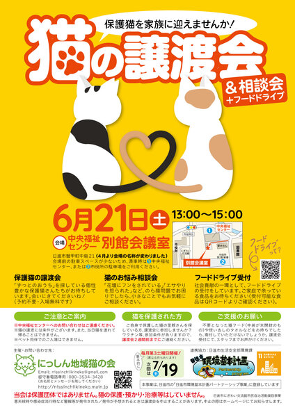 | イベント内容 | 6月21日(土)に「猫の譲渡会&相談会」を開催いたします。 保護猫を迎えたい方はもちろん、猫に関する相談会も同時開催しております。 ご近所との猫トラブルなどでお悩みの方も、どうぞお気軽にお立ち寄りください。 地域貢献の一環として、フードドライブの受付もしております。 ご家庭や職場で余っている食品がありましたらぜひお持ちください! 小さな譲渡会ですが、猫さんも人間も良いご縁を紡げられるよう、のんびり続けています。 遊びにきてくださいね(*^^*) 【日時】6月21日(土)13:00〜15:00 【会場】中央福祉センター「別館会議室」 ★★★ご注意★★★ 中央福祉センター本館内ではなく、その隣の奥まったところにある小さな建物「別館会議室」にて開催しております。お手数ですが、HPにて地図をご確認ください(中央福祉センターへのお問い合わせはご遠慮ください)。 ★★★★★★★★★ 【入場無料・予約不要】 【主催】にっしん地域猫の会 【ホームページ】https://nissinchiikineko.main.jp ※会場前に駐車場がございますが、数が少ないため、満車時は本館の駐車場をご利用ください。図書館のむかいにある市役所の臨時駐車場もご利用いただけます。 ※室内換気のため冷暖房が効きにくい場合がございます。 ※ペット同伴のご入場はできません。 ※猫ちゃんの譲渡には条件がございます。詳細はホームページをご参照ください。 |