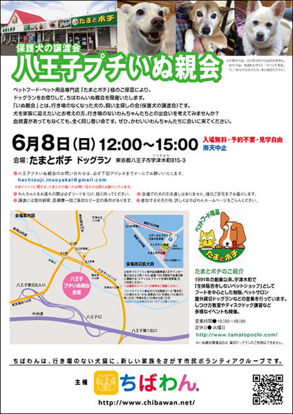 | イベント内容 | 八王子市のペットフード・ペット用品専門店 「たまとポチ」様のドッグランをお借りして、ちばわんいぬ親会(保護犬の譲渡会)を開催いたします。 預かり家庭で保護されている犬たちが、新しい家族との出会いを求めて参加します。予約不要・入場無料ですので、見学だけでもお気軽にお越しください。 【譲渡までの流れやお願い事項などをこちらのページでご確認の上、ご来場ください】 https://chibawan.net/event/20250608-hachiouji-dog ※当日参加する犬などの詳細は上記ちばわんホームページでご確認ください。 ※天候等により中止となる場合があります。開催有無は当日朝8時までに上記ページにてお知らせします。 |
