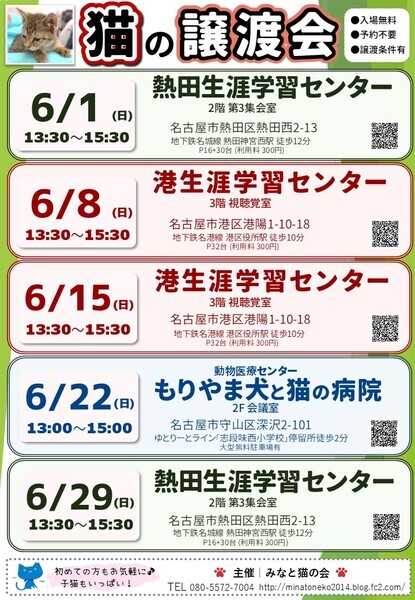 | イベント内容 | 【あなたを待つ、小さな家族】 家の中に、もう一つ温かい場所を作ってみませんか?寂しい夜も、疲れた日も、そっと寄り添ってくれる存在がいます。それぞれの個性が光る子たちとの触れ合いは、きっとあなたを笑顔にします。 ●会場は ・大型無料駐車場有 ・予約不要&入場無料 ●参加猫一覧 http://minatoneko2014.blog.fc2.com/blog-entry-1850.html ●参加猫は ・子猫も成猫も全頭ワクチン接種済 ・ノミダニ駆除済 ・トイレ躾済 ・ケージレストのトレーニング済 ●参加する猫たちについて 基本治療やトイレのしつけは済んでいます 足りないのは共に生きる新しい家族だけです 「譲渡会は行ったことがなくて不安…」 「猫を飼うのははじめて」 「今すぐじゃないけどいずれ猫と暮らしたい」 そんな皆様も大歓迎! ●譲渡に関して ※完全室内飼い・誓約書・治療費負担等の 諸条件があります。 ※譲渡やトライアルに関する契約条件は 猫の保護主によって異なります。 ●譲渡会その他についての問い合わせは みなと猫の会 minatonekonokai@gmail.com 080-5572-7004 までお願いします。 ♪参加猫ちょこっと紹介 写真2枚目 いと君 ♂ 2ヶ月 人が大好きな超甘えん坊さん 譲渡の流れなど詳しくは主催者ブログ ・みなと猫の会 ~こぴっと猫だより~ http://minatoneko2014.blog.fc2.com/ |