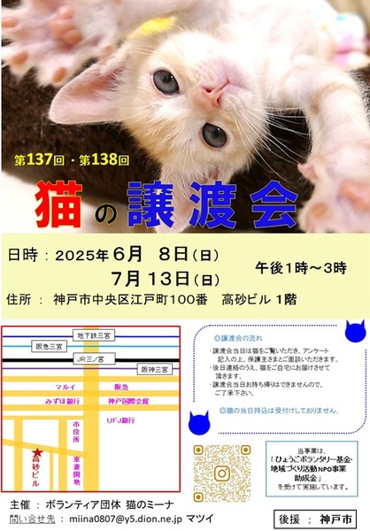 | イベント内容 | 落ち着いた大人猫も、今年生まれの仔猫も、参加します。 エエ子たちですので、可愛い姿を見に来てください 猫たちがこれからも幸せになるために、新しい家族を探しています(=^・^=) 猫は後日こちらからお届けをさせて頂き、お家の環境と脱走防止を見せて頂ければと思います。 猫は20年くらい生きる子もいますので、ご自身の年齢に合った猫さんとの出会いを探しに来てください。 ペット不可にお住まいの方はご遠慮くださいね。( ご確認してください。) 譲渡には条件が多数ありますので、ご理解くださいませ<m(__)m>。 まずはお試し(トライアル)で猫との相性を見てから、1ヶ月後に正式譲渡となります。 また、猫を保護して里親を探そうと思われている保護者の方も、〖 譲渡会に参加ねこの募集 〗をしていますので、お申し込み頂けます。 アドレス miina0807@y5.dion.ne.jp にご連絡をください。 お越しの際は各路線の三宮駅からは徒歩10分くらい、車でお越しの場合は近隣のコインパーキングなどにお停めください。 当日、体調の悪い方、発熱がある方、そんな症状の方は遠慮頂ければと思います。 定例の毎月は第2日曜日に譲渡会を開催しておりますので、次回の出会いに期待をしてくださいね。 ブログ: 猫のミーナといっしょ http://miina300.blog.fc2.com/ インスタ:nekono_mina |