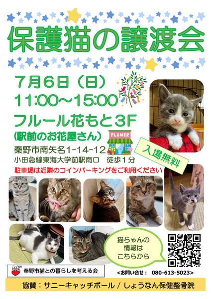 | イベント内容 | 猫の譲渡会を開催いたします。 譲渡会に参加する猫ちゃんは、随時ホームページに掲載していきます。 https://hadanoneko.org/category/recruitment/ 日時:2025年 7月6日(日) 11:00~15:00 会場:フルール花もと 3F 住所:神奈川秦野市南矢名1丁目14-12 アクセス: 電車:小田急小田原線「東海大学前駅」より徒歩2分 車 :国道246号線 桜坂交差点より12分 東名秦野ICより17分 駐車場は近隣のコインパーキングをご利用下さい ● 事前の申し込み等は不要です。 https://hadanoneko.org/jouto-2025-7-6/ |