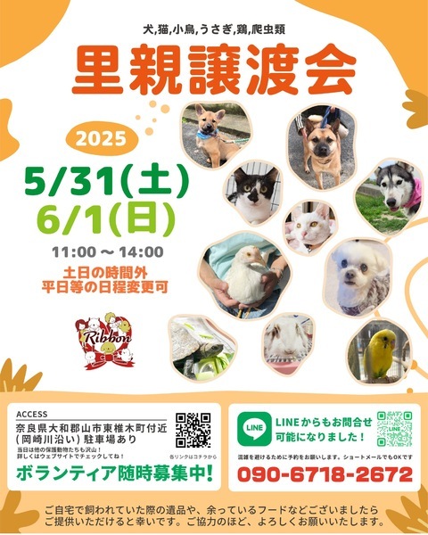 | イベント内容 | \譲渡会を開催します/ 子犬や子猫、小型犬から大型犬、かわいい猫ちゃんたちまで、たくさんの保護犬・保護猫が皆さんを待っています! 写真だけでは伝えきれない魅力が盛りだくさんなので、ぜひお気軽に足を運んでくださいね。 【里親募集中の犬猫情報はコチラ】 https://satoya-boshu.net/foster/?@button_name@=search&FosterParent_MemberID=85262 ●事前にお電話かショートメールでご予約をお願いします。 ・予約番号:090-6718-2672 ●ご希望の犬猫がいましたら、予約時に名前をお伝えください。 ●当日までに譲渡が決定した・体調がすぐれないなど、やむを得ない理由で急きょ不参加の場合があります。ご了承ください。 ●その場での引き渡しはしておりません。譲渡決定後、距離にかかわらずこちらからお届け致します。 みなさまのご来場をお待ちしております! ⚫︎りぼんは、奈良県で活動している動物保護団体です。 犬・猫・うさぎなどの小動物・インコやニワトリなどの鳥・両生類・爬虫類など動物種を問わず、お届け先も地域を問わず、動物たちと里親さまをつなぐ活動を行っています。 ◎ホームページ https://ribbon-foster.jimdofree.com/ ◎公式YouTube https://www.youtube.com/@ribbon-shelter https://www.instagram.com/ribbon_shelter/ https://www.instagram.com/ribbon_shelter1/ |