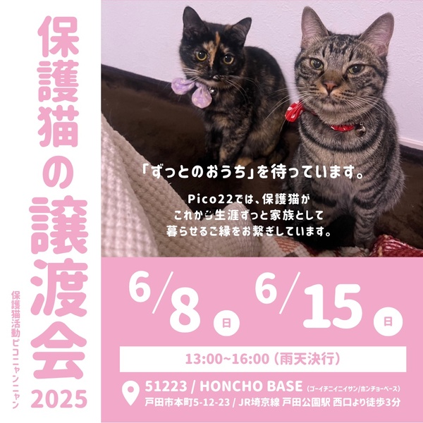 | イベント内容 | <保護猫を家族に迎えたいとお考えの方へ> ご家族に迎えていただき、生涯愛情を注いでいただける里親様をお待ちしています。 猫の飼育が初めての方には、丁寧にアドバイスもさせていただきますので、ご安心ください。 会場:51223/HONCHO BASE(ゴーイチニイニイサン/ホンチョーベース) 戸田市本町5-12-23 埼京線 戸田公園駅(西口)徒歩3分。 ※戸田公園駅西口ロータリーを出て、オリンピック通りの本町二丁目交差点を横断し直進してく ださい。 立て看板のある細い道を左折してください。 お車の方は、付近のコインパーキングをご 使用ください。 ※会場までのルートは、以下のPico22サイト内の動画をご参考になさってください。 <譲渡会に参加をご検討の皆様へ> ご予約優先となりますので、以下のPico22サイト内お問い合わせフォームよりご予約をお願いいたします。 ご予約なしでも可能ですが、皆様のご協力をお願いいたします。 <譲渡会に参加する保護猫> 可愛い保護猫が参加します。 参加する保護猫の情報は、以下のPico22保護猫ブログをご覧ください。 ●ご予約・お問い合わせ:Pico22(ニャンニャン)https://www.officemirai.com/cat ●Pico22保護猫ブログPico22保護猫活ブログ:https://ameblo.jp/toko-chino/ ●Pico22インスタグラム:https://www.instagram.com/pico22_?igsh=MTJ6YnM3NmZiamhx |
