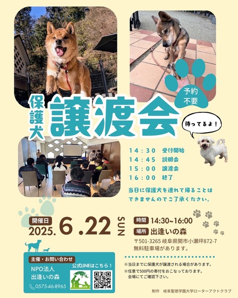 | イベント内容 | 出逢いの森の犬たちの譲渡会を開催します! 個性豊かな犬たちにぜひ会いに来て下さい! 14:30 受付開始 14:45 説明会 15:00 ふれあい・見学 16:00 終了 予約は不要です。 当日に犬を連れて帰ることは出来ません。 ※以前説明会にご参加していただいた方は、説明会参加不要です。15:00までにお越しください。 ※当日の体調等により、写真の保護犬がいない場合もございます。予めご了承ください。 譲渡会に参加の際、任意のご寄付を500円からお願いしております。 参加犬や譲渡条件、会場へのアクセスなどの詳細は、「出逢いの森」ホームページをご覧ください。 https://deaimori.com/foster-parents/ |