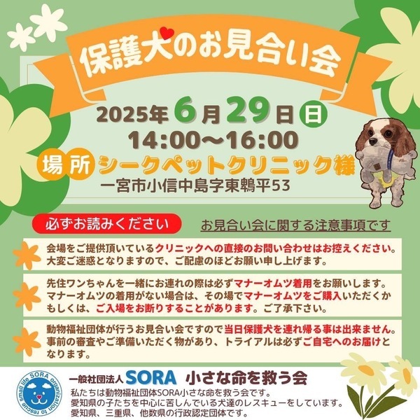 | イベント内容 | 保護犬のお見合い会を開催致します。 先住ワンちゃんを一緒にお連れの際は必ずマナーオムツ着用をお願いします。 マナーオムツの着用がない場合は、その場でマナーオムツをご購入頂くか、もしくは、ご入場をお断りすることがあります。ご了承下さい。 【注意】会場をご提供頂いている病院への直接のお問い合わせはお控えください。 急患時は命に関わり、大変ご迷惑となります。 ご配慮のほどお願い申し上げます。 シークペットクリニック様 〒494-0007 愛知県一宮市小信中島字東鵯平53 <ご注意> 事前のお申込みは不要です。保護活動ブログで、開催日の数日前に譲渡会参加が決定したワンコたちのご案内もしておりますので、ご希望のワンコの参加をご確認してお越し頂けますと幸いです。 SORA公式ホームページ https://sora-chiisana.org/foster/ SORA公式活動メインブログ https://ameblo.jp/sora-chiisana-inochi/ SORAイベントブログ https://ameblo.jp/sora-charity-events/ |