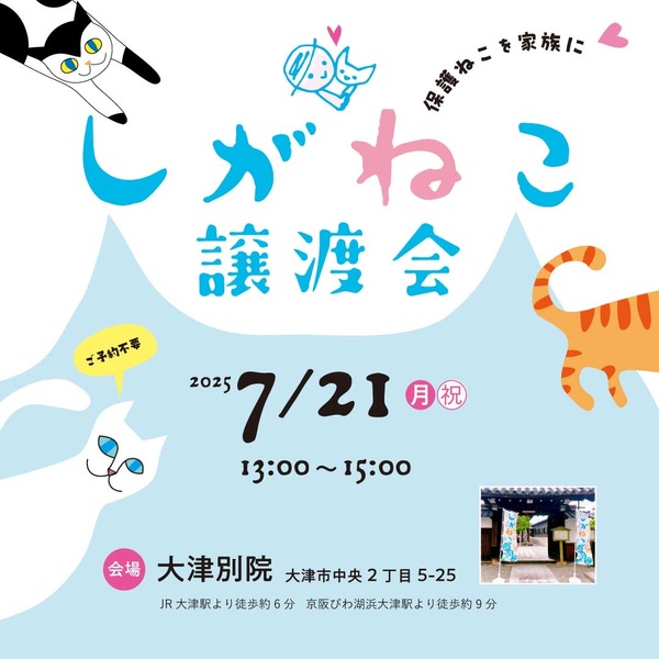 | イベント内容 | お寺で開催している、保護猫の譲渡会です。 開催日:2025年7月21日(月祝) 時間: 13:00~15:00 会場: 大津別院 ●JR大津駅から徒歩6分 ●京阪浜大津駅から徒歩9分 ●お車でお越しの際は近くにコインパーキンがいくつかございますのでそちらをご利用ください。 ご予約は不要です。 ご入場の際、譲渡会運営費のご協力金として、1グループ500円のお支払いをお願いしております。 ※来場者が多い場合は、入場制限をさせていただく場合がございます。また、猫たちの負担を考え、15時になりましたら帰る準備を始めます。猫たちとゆっくり向き合っていただきたいと思いますので、お早めの入場をお願いいたします。 猫を飼ったことがない方でも、これから猫を迎えたいなと思っている方も、譲渡会って何?という方も、ぜひかわいいねこさん達に会いに来てください。 猫たちとずっとのおうちの幸せのご縁をつなぐ場となることを願って、たくさんのご来場をお待ちしております。 ★会場へのお問合せはご遠慮下さい。 ★ご質問やご不明な点がございましたら、しがねこ譲渡会インスタグラムDMへご連絡下さい。@shiganeko.event |