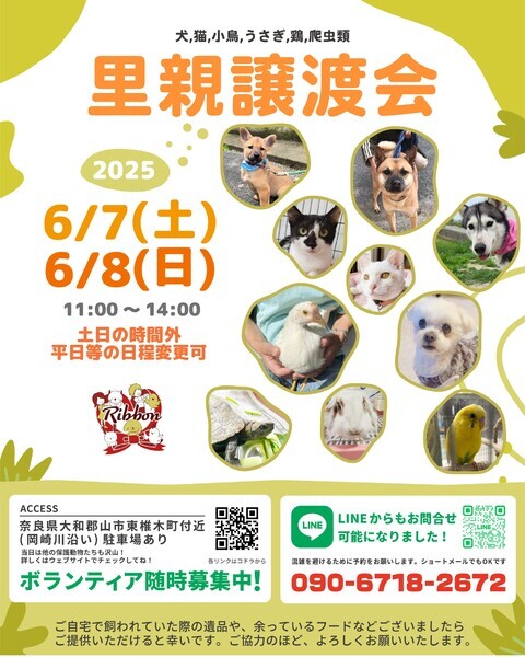 | イベント内容 | \譲渡会を開催します/ 子犬や子猫、小型犬から大型犬、かわいい猫ちゃんたちまで、たくさんの保護犬・保護猫が皆さんを待っています! 写真だけでは伝えきれない魅力が盛りだくさんなので、ぜひお気軽に足を運んでくださいね。 【里親募集中の犬猫情報はコチラ】 https://satoya-boshu.net/foster/?@button_name@=search&FosterParent_MemberID=85262 ●事前にお電話かショートメールでご予約をお願いします。 ・予約番号:090-6718-2672 ●ご希望の犬猫がいましたら、予約時に名前をお伝えください。 ●当日までに譲渡が決定した・体調がすぐれないなど、やむを得ない理由で急きょ不参加の場合があります。ご了承ください。 ●その場での引き渡しはしておりません。譲渡決定後、距離にかかわらずこちらからお届け致します。 みなさまのご来場をお待ちしております! ⚫︎りぼんは、奈良県で活動している動物保護団体です。 犬・猫・うさぎなどの小動物・インコやニワトリなどの鳥・両生類・爬虫類など動物種を問わず、お届け先も地域を問わず、動物たちと里親さまをつなぐ活動を行っています。 ◎ホームページ https://ribbon-foster.jimdofree.com/ ◎公式YouTube https://www.youtube.com/@ribbon-shelter https://www.instagram.com/ribbon_shelter/ https://www.instagram.com/ribbon_shelter1/ |