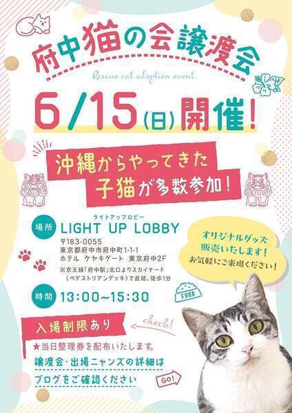 | イベント内容 | ୨୧⌒⌒⌒⌒⌒⌒⌒⌒⌒⌒⌒⌒⌒⌒⌒୨୧ 府中駅直結⭐︎譲渡会のお知らせ ୨୧⌒⌒⌒⌒⌒⌒⌒⌒⌒⌒⌒⌒⌒⌒⌒୨୧ 【 日時 】6月15日(日)13時〜15時半まで 【 場所 】LIGHT UP LOBBY (ホテル ケヤキゲート 東京府中2F) ※混雑時は、整理券を配布。ご予約は必要ありません。 https://chuneko.exblog.jp/32603337/(会場へのご案内) ※会場への直接のお問い合わせはお控えください。 ご質問は、fuchu_nekonokai@yahoo.co.jpまで こんにちは。『NPO法人府中猫の会』です。 地元のTNR活動&保護活動(野良猫を増やさない取り組みや行き場のない猫達の保護)に尽力しているボランティア団体です。 その他にも当ボランティアの取り組みとして、地方の行き場のない猫達の保護にも力をを入れております。 今まで『熊本殺処分STOPプロジェクト』を掲げて約200匹の猫達を空輸して来ました。 そして、今現在は『沖縄プロジェクト』に着手しております。現在沖縄全土(やんばる地区や離島含む)から、たくさんの子猫達を空輸して来ております。 今回の譲渡会でご紹介する子達は沖縄っ子達ばかりが参加となります。 みんな、どの子も行き場のない子達ばかりです。 一生の家族を求めて譲渡会に出場しますのでどうぞよろしくお願い申し上げます。 ◉子猫は未去勢or未避妊です(施術する時期やエリザベスカラーなしで日帰り入院できる病院など当会がアフターケアーできますのでご安心ください。) ◉子猫は半日ぐらいのお留守番が出来るように躾けてから譲渡会に出しますのでご安心ください。(トイレ訓練や家猫訓練をさせた上での譲渡となります。) ◉成猫さんは飼いやすさ抜群です!お仕事をフルタイムでお持ちのご家庭でも問題なく受け入れていただけます。 活動内容や保護猫達の様子が気になる方は、ぜひ!YouTubeちゅー猫チャンネルをご視聴ください。 ↓↓↓ ฅ^•ﻌ•^ฅ♡ちゅー猫チャンネル https://youtube.com/@chuneko 【 よくあるご質問 】 ◆猫を飼いたい。でも保護猫ってハードルが高い気がする… その点はご安心ください。出場する全ての猫達はみんな家猫訓練を受けており、トイレ訓練もパーフェクトな猫達です。 猫飼い初心者OKな猫ちゃんも多数出場します。 ◆60歳を超えているが、猫を迎えたい。 今時の60代様、70代様は、大変お若くアグレッシブでいらっしゃいます! そんな方々にはぜひ成猫さんをオススメさせていただきます。 今回出場する成猫さんは、捨てられた子達ばかりです。(多頭崩壊、飼育放棄、夜逃げによる強制執行) みんな心に傷を負っている子達を保護しております。しばらく心のケアや家猫訓練をバスした子達を出場させますので、ぜひ!会いに来てください。 ※60歳以上の方は後継人をお願いしております。後継人の方とご来場いただくと私達も選考しやすいのでよろしくお願いします。 ◆わが子の為にも保護猫を迎えたい!しかし、私達家族一同、猫を飼うのは初めてです。どうしたらいいですか? そのようなご家庭こそぜひ!お待ちしております! 猫ちゃんの魅力を知っていただきたいのと、お子様が保護猫達と一緒に育つ事により『命に優しい情操教育』となると願っている当会です。 喜んでお待ちしております。 ※猫アレルギー問題があります。初めて猫を飼う方は猫アレルギー検査を事前にしていただくと私達も選考しやすいです。 特にお子様には必ず検査をお願いします。 ◆仕事があって、お留守番をさせるのが心配… ご心配はご無用です! 今回出場する子達はみんな成猫さんなので、一日フルタイムでお仕事をお持ちのご家庭でも問題なく迎えていただける子達ばかりです。 【 譲渡会にご参加くださる方々へ 】 ₍ᐞ•༝•ᐞ₎◞ ̑̑ ◎混雑を防ぐ為、入場制限をさせていただきますが、ご予約の必要はございません。 入り口カウンターにてスタッフが整理券を配布いたしますのでご協力お願い申し上げます。 ₍ᐞ•༝•ᐞ₎◞ ̑̑ ◎初めて猫ちゃんを迎える方(特にお子様のいるご家庭)は、猫アレルギーの有無を明確にしてくださると選考しやすいです。 ₍ᐞ•༝•ᐞ₎◞ ̑̑ ◎譲渡会はお見合いのみの場となっております。 ご来場前に必ず下記の事項をご参照ください。 ▶︎譲渡会のシステムについて◀︎ https://chuneko.exblog.jp/32604872/ 【見学希望やご支援者の方々へ】 ₍ᐞ•༝•ᐞ₎◞ ̑̑ いつもありがとうございます♡ 会場には、カフェもございます。 お飲み物をご注文くださればお席にご案内いたします。(入口スタッフに一言お申し出ください。) 大変申し訳ないのですが、里親希望の方々を優先的にご案内させていただくのをご了承の上、お越し下されば幸いです。 会場では、ちゅー猫オリジナルグッズも販売しております。 普段、ネットで販売している公式グッズの現物をお手に取ってご覧いただけます。 |